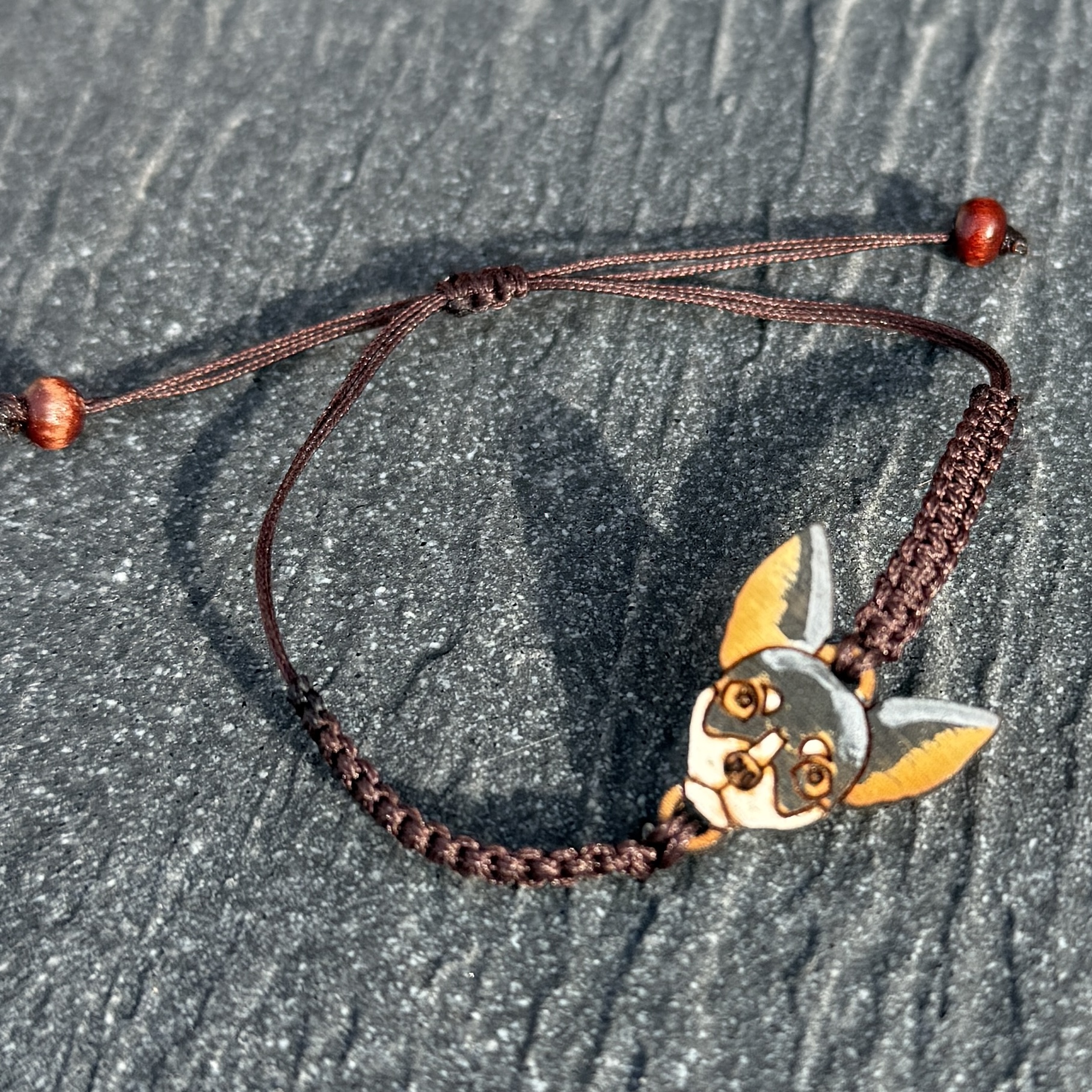 Ručně vyráběný náramek světlý s dřevěným medailonkem hlavičky pejska - čivava .