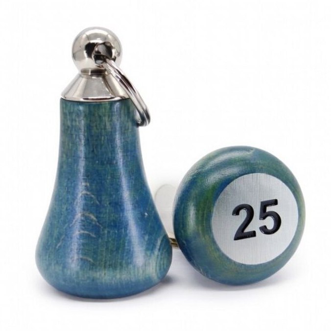 Dřevěná hotelová klíčenka s kovovým uchycením a kroužkem na klíče ve tvaru hrušky. Klíčenka je doplněna o gumový kroužek, který brání poškození dveří a samotné klíčenky.