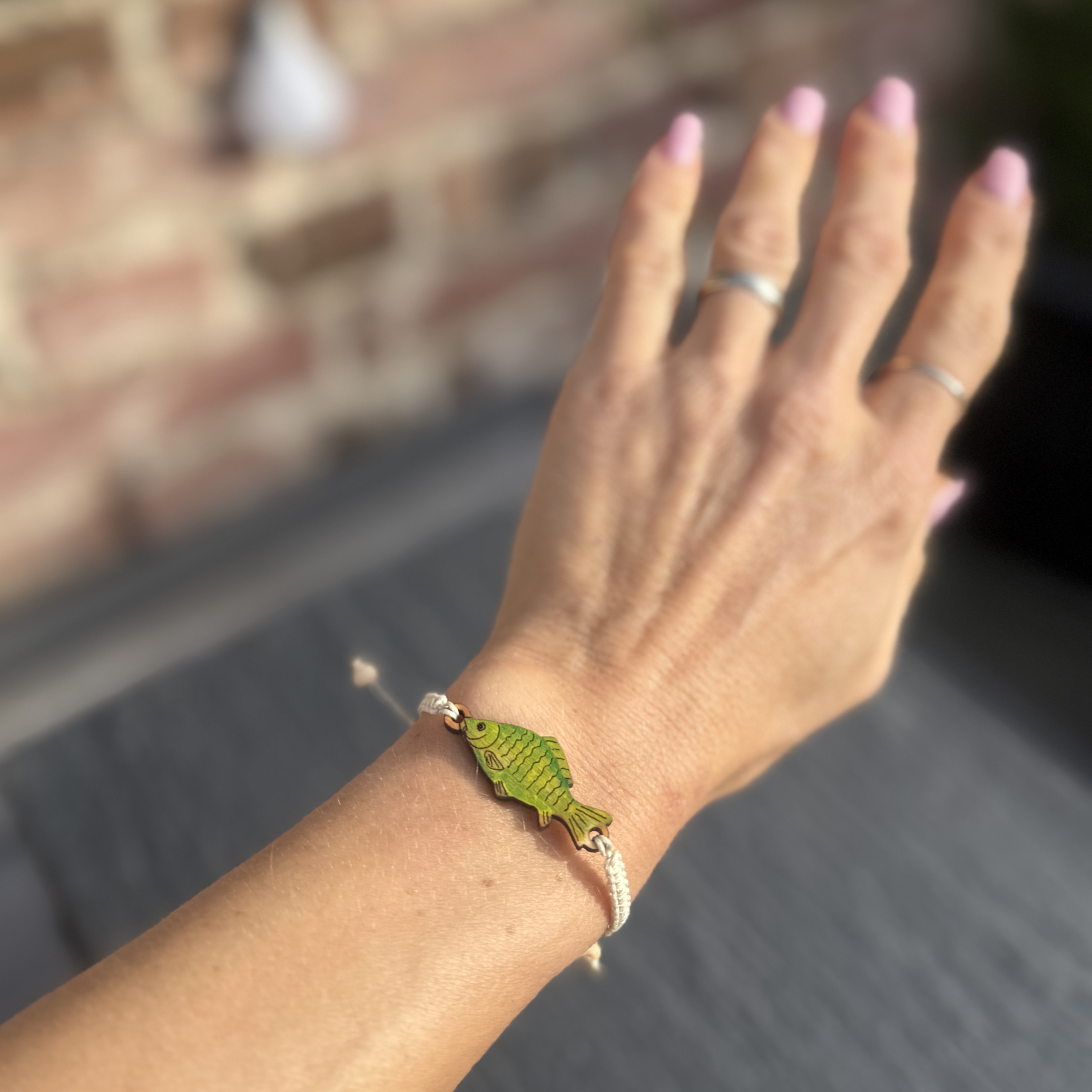 Ručně vyráběný náramek světlý s dřevěným medailonkem kapříkem.