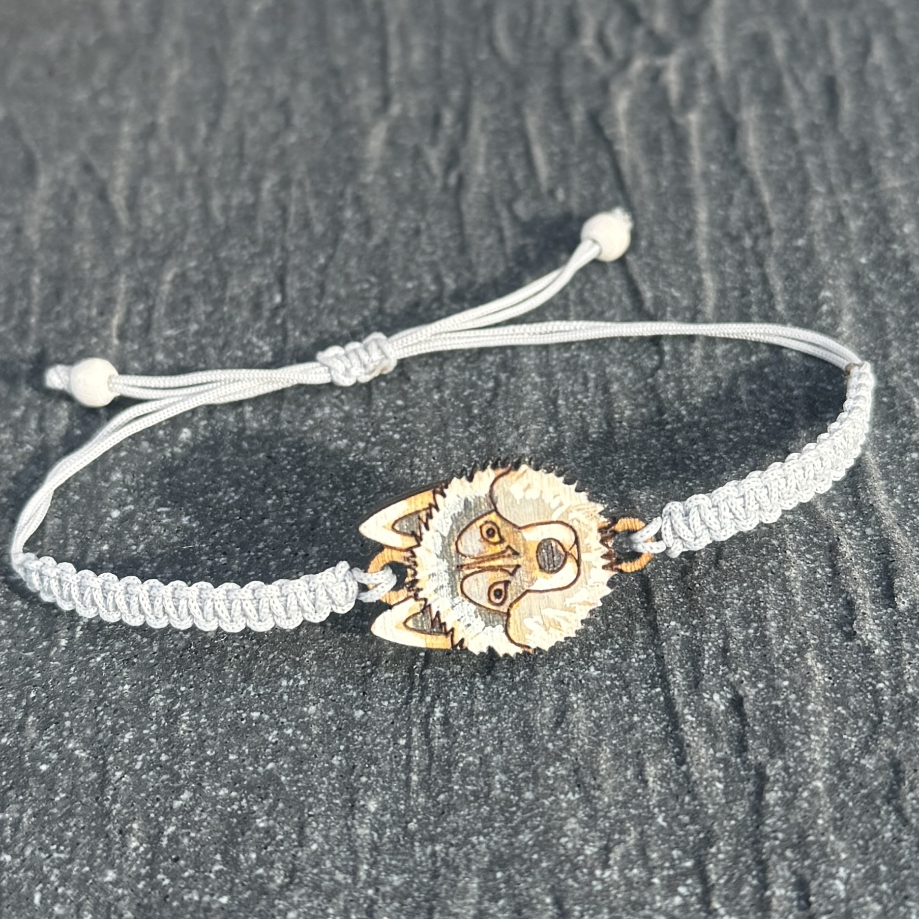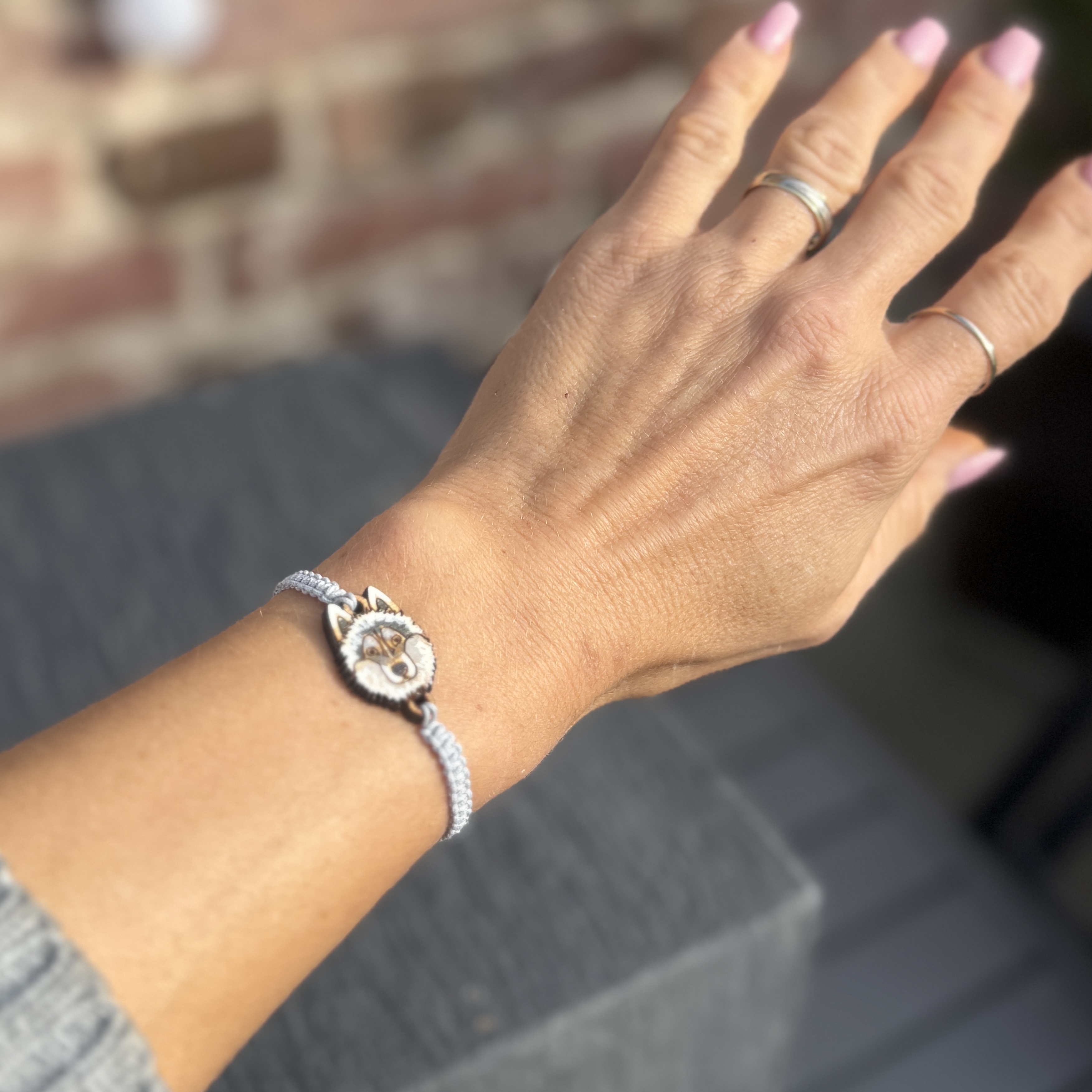 Ručně vyráběný náramek ve světlé barvě s dřevěným medailonkem hlavy psa.